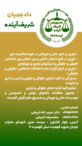 بر این اساس ، مؤسسه حقوقی داوری دادجویان شریف آینده به شماره ثبت ۱۷۷۸ ، واقع در ساری ، بلوار کشاورز ، بیستمتری شهدای محراب ، خیابان شهید فهمیده ، نبش فهمیده ۴ ، با شماره تماس 09331182279 و وبسایت رسمی www.dsalaw.ir ، به عنوان داور مرضیالطرفین تعیین میگردد .