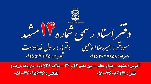 نمایش موقعیت مندفتر اسناد رسمی 14 مشهد در محله دانش آموز مشهد و بلوار معلم واقع شده است. این دفتر یکی از نه دفتر اسناد رسمی در محله دانش آموز مشهد میباشد و از نظر موقعیت جغرافیایی در نزدیکی درمانگاه شبانه روزی شهید چمران، پمپ بنزین معلم جایگاه 114، آموزشگاه رانندگی حافظ ران، لوازم یدکی آل رضا و مجتمع نان نانک قرار گرفته است. همچنین با توجه به نظراتی که کاربران در اپلیکیشن نشان به این مکان دادهاند میتوان گفت این دفتر یکی از دفاتر اسناد رسمی خوب این منطقه میباشد.
