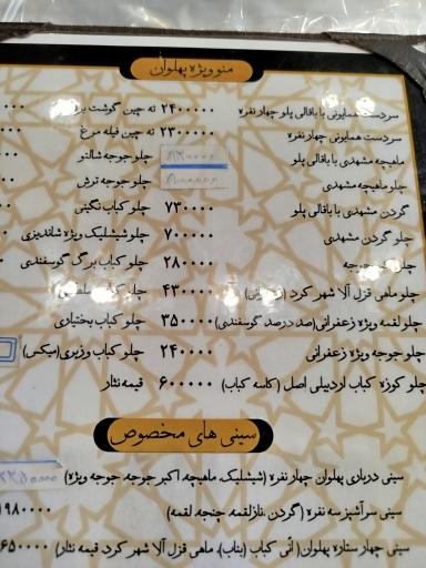 قیمت هاش خیلی بالاس کیفیتش هم تقریبا معمولیه ما بختیاری و باقالیپلو با گردن و زیتون و دوغ گرفتیم از بین اینها بجز دوغش بقیهش رو اصلا پیشنهاد نمیکنم بختیاریش که تقریبا افتضاح بود بشدت سفت و خشک، من دندون درد گرفتم باقالیپلوش هم طعم خوبی نداشت و نخاع گردن رو جدا نکرده بودن زیتونش هم تیکه های سفت داشت فکر کنم پوست گردو بود هرچند توی عمرم دوغ به این گرونی نخورده بودم ولی واقعا خوش طعم بود اگر مثل ما اشتباه کردین و رفتین اونجا حتما دوغش رو بخورین