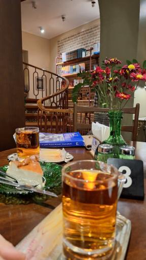 محیط کافه رو دوست دارم. تمیز و زیبا. میز و صندلی راحت. فضای داخل با نور مناسب و فضای بیرون با گرمایش/سرمایش مناسب. طبقه بالا هم که کتابفروشی هست و تنوع زیادی داره. غذاهاش خوشمزه اس ولی یه مقدار گرونه.