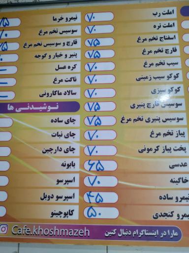 کافه صبحانه مهربانو کرمان واقعا غذاهاشون عالی هرگونه صبحانه ای که بخواهین دارن با کارمندانی بسیار موأدبانه صندلیها تو مغازه و بیرون تو پیاده رو. هرجا که دوست داشته باشی صبحانه تون میل می کنید بعد از صبحانه. چایی زنجبیل یادتون نره پیشنهاد می کنم حتما بروید و تجربه کنید خانم جهانشاهی مسعول و سرپرست آنجا یه خانم کرمانی اصیل و آشپز حرفه ای برای تهیه صبحانه اگر رفتین حتما بگین از روی مسیریاب نشان آمدیم ممنون از لطف شما