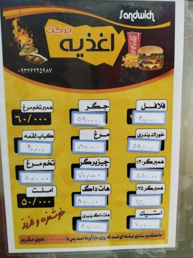یکی از فست فودهای شهر مشهد، فست فود ساندویچی برکت است که در محله شهید قربانی قرار گرفته است. شماره تلفن فست فود ساندویچی برکت 09153211968 است که شما میتوانید از طریق آن هر اطلاعاتی در مورد این مکان نیاز دارید، به دست آورید.