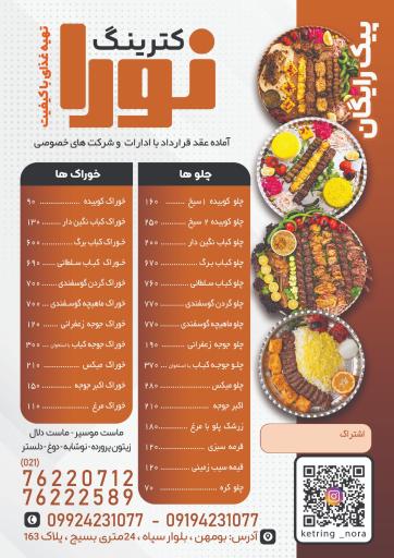 کترینگ نورا (کترینگ و تهیه غذا) در بومهن و خیابان بسیج واقع شده است. و از نظر موقعیت جغرافیایی در نزدیکی تولید و پخش لباس فرم مسعود، خشکبار عالیجناب، کانال سازی محمدی، تعمیرگاه تخصصی مسلم و نان بربری قائم قرار گرفته است.