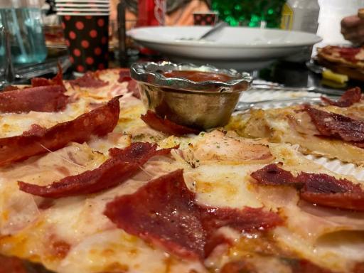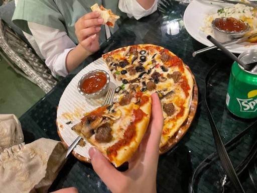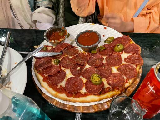 اولش با یه نوشیدنی از ما پذیرایی کردن و پیتزای پیرونی اونقدر تند نیست که اذیت شید و بسیار خوشمزه و گرون هست منو