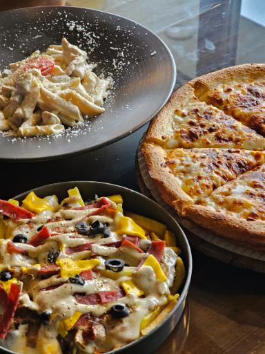 کیفیت غذاها خیلی خوب بود ومعلوم بود که مواد اولیه شون با کیفیت، ما پیتزا، سالاد سزار و سوخاری سفارش دادیم و از طعم و کیفیت راضی بودیم، برخورد پرسنل هم خوب بود