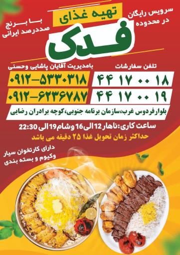 تهیه غذای فدک (کترینگ و تهیه غذا) در محله سازمان برنامه جنوبی تهران و خیابان وحید جنوبی واقع شده است. این مکان یکی از چهار کترینگ و آشپزخانه در محله سازمان برنامه جنوبی تهران میباشد و از نظر موقعیت جغرافیایی در نزدیکی مراکز مهمی مانند شهربازی رَهان و بازارچه قمر بنی هاشم و همچنین بوستان پرنیان، اغذیه نوش و نشاط، سرای محله سازمان برنامه جنوبی، مسجد قمر بنی هاشم علیه السلام و باطری سازی غرب قرار گرفته است.