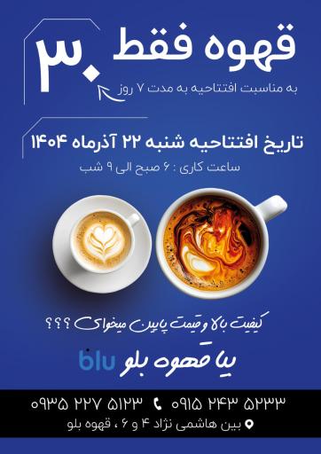 قهوه بلو (کافیشاپ) در محله آیت الله کاشانی مشهد و خیابان شهید هاشمی نژاد واقع شده است. این کافیشاپ یکی از نه کافیشاپ در محله آیت الله کاشانی مشهد میباشد و از نظر موقعیت جغرافیایی در نزدیکی مراکز مهمی مانند موزه نادری و پاساژ گنجینه کتاب و همچنین دبیرستان نمونه دولتی مهشید مصلی نژاد، ایستگاه اتوبوس پایانه شهید هاشمی نژاد، بنگاه برنج زوار، پارکینگ عمومی شهید هاشمی نژاد و آشپزخانه و پذیرایی محبان الرضا قرار گرفته است. همچنین با توجه به نظراتی که کاربران در اپلیکیشن نشان به این مکان دادهاند میتوان گفت این کافیشاپ یکی از کافیشاپهای خوب این منطقه میباشد. با توجه به نزدیکی این کافیشاپ به ایستگاه مترو شهدا، برای دسترسی راحتتر و کمک به داشتن هوایی پاکتر، میتوانید از وسایل حمل و نقل عمومی برای مراجعه به آن استفاده کنید.