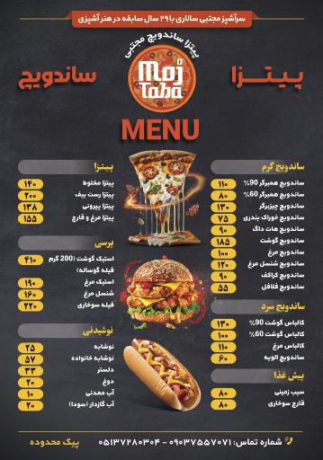 فست فود پیتزا مجتبی را میتوانید در شهر مشهد، محله کلاهدوز پیدا کنید. شما میتوانید هر اطلاعاتی در مورد فست فود پیتزا مجتبی نیاز دارید، از طریق شماره تلفن آن (05137280304) به دست بیاورید. شما میتوانید برای دیدن منو و عکسهای بیشتر به آدرس وبسایت این فستفود (tapsi.food) مراجعه کنید. همچنین برای مشاهده فضا و عکس و فیلمهای مربوط به فست فود پیتزا مجتبی میتوانید به صفحه اینستاگرام آن به آدرس pizza_mojtaba بروید.