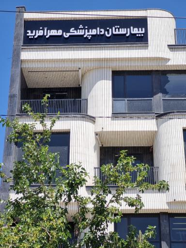 بیمارستان دامپزشکی مهرآفرید (کلینیک دامپزشکی) در محله امیریه مشهد و خیابان عصمتیه واقع شده است. و از نظر موقعیت جغرافیایی در نزدیکی ایستگاه اتوبوس عصمتیه 7، مهد کودک مهر و ماه، میوه فروشی آراد، ام دی اف بهروز و تعمیرات پکیج رادیاتور قرار گرفته است.