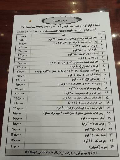 ساعت کاری، اطلاعات و آدرس دقیق این رستوران را در ادامه میبینید. اگر به رستوران فاطمی رفتید، یادتان باشد که حتماً نظر خودتان را در بخش نظرات با ما در میان بگذارید.