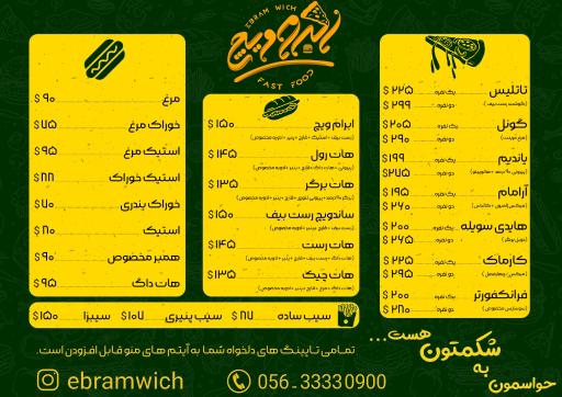 آدرس فست فود ابرام ویچ در شهر بیرجند، محله جماران است. شماره تلفن فست فود ابرام ویچ 05633330900 است که هر اطلاعاتی در مورد این مکان نیاز داشته باشید در اختیار شما میگذارد. منوی این فست فود و عکسهای بیشتری از آن در اینستاگرام https://instagram.com/ebramwich قابل مشاهده است.