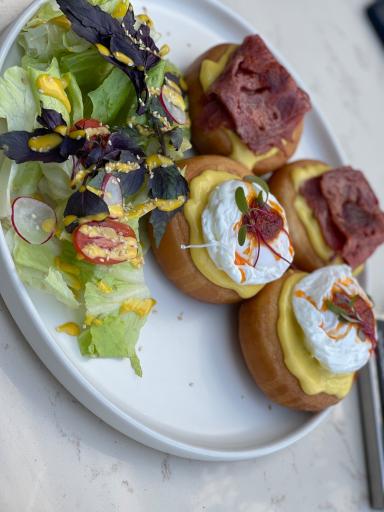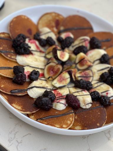 صبحانه ما انگلیش مافین و پنکیک بود با عسل وشکلات وخامه که کیفیت و فضا خیلی بود