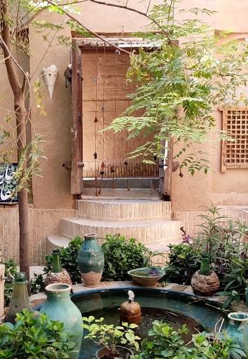 محیطی دنج آرام و با معماری کم نظیر و منحصر به فرد به محض ورود حیاط نقلی و صمیمی همراه با حوض نقاشی و گیا هان سرسبز و سایه خنک و مطبوع روح انسان را تازه میکند ، در اطراف حیاط گالری آثار نقاشیست که دیدن و بازدید آنرا توصیه میکنم .بعد از آن به پشت بام رفتیم و ویو بی نظیر انسان را در تاریخ غوطه ور میکند ، خط اسمان متنوع با ابنیه و بادگیرها وگنبد آبی، فیروزه ایی در مجاورت خانه ،جلب توجه میکند. پرسنل تحصیل کرده و مودب و همچنین پذیرایی دلنشین با نقاشی های ساده و روایت گونه از زندگی ،معماری و ابنیه های شهر و مجموعه موسیقی انتخاب شده در حال پخش ساعتها انسان را مدهوش میکند ...