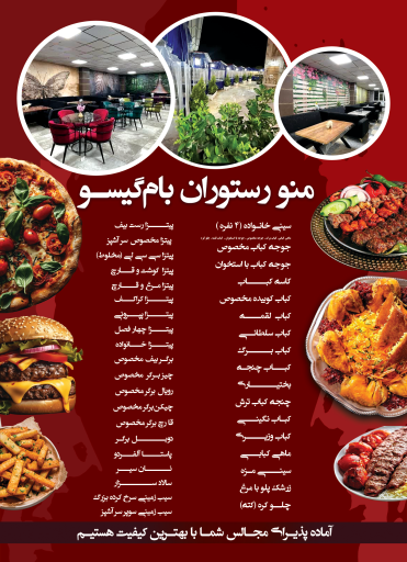 کافه رستوران بام گیسو در حسن آباد و خیابان سید جلال موسی کاظمی واقع شده است. و از نظر موقعیت جغرافیایی در نزدیکی باشگاه بدنسازی تندیس، پارک سادات، نان فانتزی محمدی، ساندویچی و گالری پاتل قرار گرفته است.